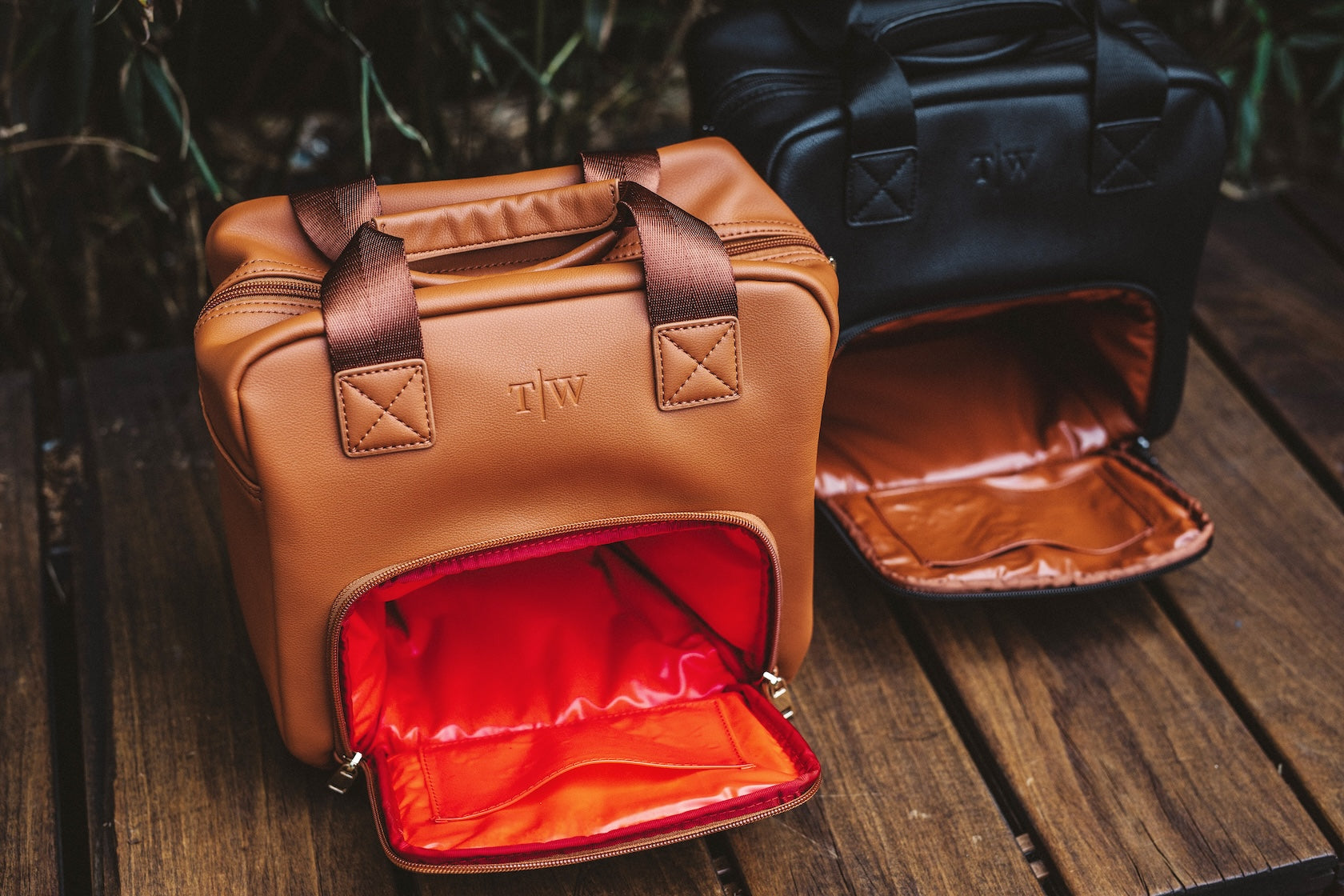 T|W premium lunch totes sport either a vibrant red interior or an eye catching cognac interior.